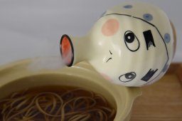 【あらすじ】 寒さが身に凍みはじめた冬のこと,横丁に蕎麦屋が開店した.行ってやれば義理にもなると,二人連れがのれんをくぐる.貼りだされた品書きを見ると,鴨南蛮,天麩羅などのほかに,ひょっとこというのが目にとまった. 「新規お二人さん,ひょっとこふたつ〜」「うれしいね.みんなにも吹聴してやろうよ.ときに種は何だろうね,値段が安いから大したものではないだろう」「豆絞りの手ぬぐいを利かせて豆かなんか入ってるんじゃないかい」「なるほど,馬鹿を利かせてバカ貝を入れてあると思うね」「何しろ,お客をあっと言わせて評判を取ろうという亭主の考えにちがいない」「へい,お待ち遠さま」「存外はやいね.この,蓋を取ってみるのが楽しみだ.はて,恐ろしく熱いが,ただのかけ蕎麦みたいだ」「そうだな.フーッ.馬鹿熱だね.中にも種がないなあ」 「おいおい,ねえさん,これがひょっとこかい.恐ろしく熱いが,何にも入っていないじゃないか」「はい.左様で」「ふざけちゃいけない.どうしてこれがひょっとこなんだい」「フーッと吹いて召し上がる,あなた方の顔がひょっとこでございます」 【ひとこと】 ○「さうだね。できものはと‥‥ああ書いて貼つてあるよ。天ぷら、鴨南蛮、これはお約束だね。それからあられ蕎麦、鍋焼、おかめ、ひよつとこ‥‥ひよつとこ‥‥おい、御覧よ、ひよつとこ蕎麦。余り聞いたことがないね。」 △「なるほど珍しいな。」 女「当店独特でございます。」(ひよつとこ蕎麦) ひよつとこ蕎麦(ひょっとこそば)は,『家の光』16巻2号に掲載された.柳家小さん演と書かれている.挿絵1枚.『落語事典』には「ヒョットコそば」の演題で載っている. 【つけたし】 寒い冬の季節感や洒落好きの江戸っ子が出てこなければ,サゲの種明かしをするだけの底の浅い噺になってしまう.談州楼燕枝(2)がSP盤に3分半で「ひょっとこそば」を吹き込んでいる.燕枝の口調のせいなのか,最後の"旦那の顔がひょとこで〜"の後味があまりよくない.そのせいで,かえって記憶に残っていた.『落語事典』によると,四代目春風亭柳枝が演じていたとあるが,他に速記になったものを見たことがない. なまじ,おかめそばが,おかめの顔に見立てて具材を盛りつけているのを知っているだけに,ひょっとこの顔をこしらえてあるか,ひょっとこにちなんだ洒落が利いた種ものが入っているはずと,江戸っ子ならば思うだろう.おかめそばは,島田湯葉で髪をかたどり,タケノコで櫛,カマボコが頬っぺたになるなど,もともとは,さまざまな具材で器の中におかめの顔を描いていた.あられそばが,小柱で霰のつぶに見立てたり,もみ海苔を花に見立てた花巻そばなど,粋なネーミングのそばも多い.ひょっとこそばを食べた客も,主人に一杯食わされたと,帰ってから笑い話の種にしたことだろう.たぬきそばは,もともと揚げ玉をまとめて天ぷらにみせかけて化かしたことが,名前の由来の一つだという.「俺タヌキ,私キツネ」.そば屋での注文は,外国語に直訳したら,化け物屋敷になってしまう. |
