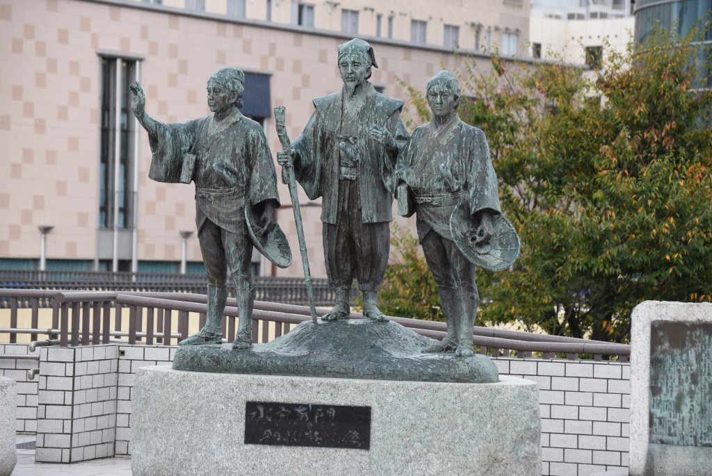 水戸駅北口の高架道に出ると,水戸黄門主従が印籠をかざしてお出迎えしてくれる.
