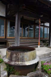 日蓮宗妙典寺が正しい.奉納された大釜で雨水を受けているのがユニーク.こんなふうに水がたまっていれば,「釜どろ」にも盗まれまい.