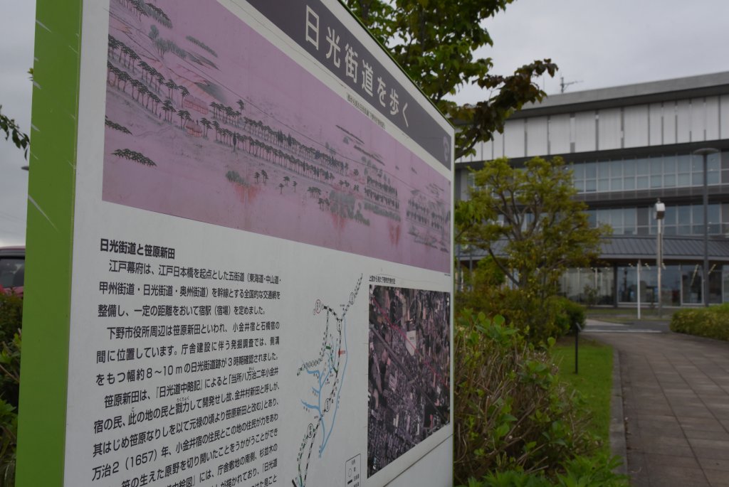 笹原だった土地を開発して新田とした.現在の地名は,もとの笹原となっている.国分寺町などが合併後,下野市役所が新設されたことで,旧日光街道がそこで分断された.市役所敷地内の日光街道の案内板に,ここが笹原新田であったことと,発掘調査で側溝をもつ街道跡が見つかったことが記されている.圓朝はここから筑波山を遠望した.明治の初めにはよく見えた筑波山も,ビルにさえぎられてしまい,新幹線の車窓からしか望めない.