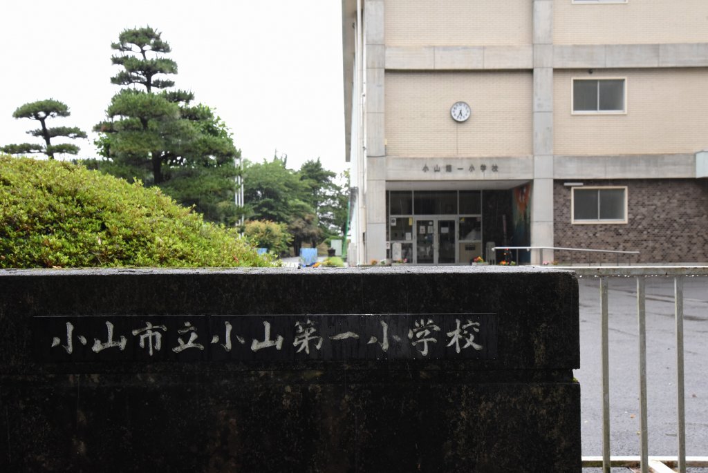 1873(明治6)年開校の小山小学校(現 小山第一小学校)のことだろう.市役所のすぐ南に位置する.校門前に道標がある.