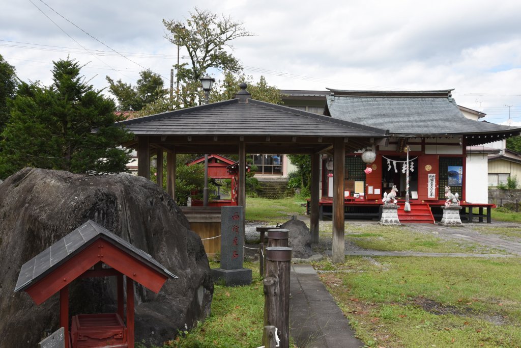 岩波版のルビは,いねまち.稲荷町(いなりまち)のことだろう.鉢石町などの東,街道北に並行する.稲荷社には,写真のような巨石がある.西行法師が,この石の上に座った少年にどこへ行くか尋ねたところ,"冬萌きて夏枯れ草を刈りに行く"と麦を刈ることを謎かけ歌で答えた.これを聞いた西行は,男体山を遙拝し,そのまま引き返した.その由来から,西行戻石と呼ばれる.同じ場所に西行歌碑がある."ながむながむ散りなむことをきみも思へ くろ髪山に花さきにけり".日光の黒髪山を詠んだとすれば,少年の戯れ歌よりも格が高いのだが…….