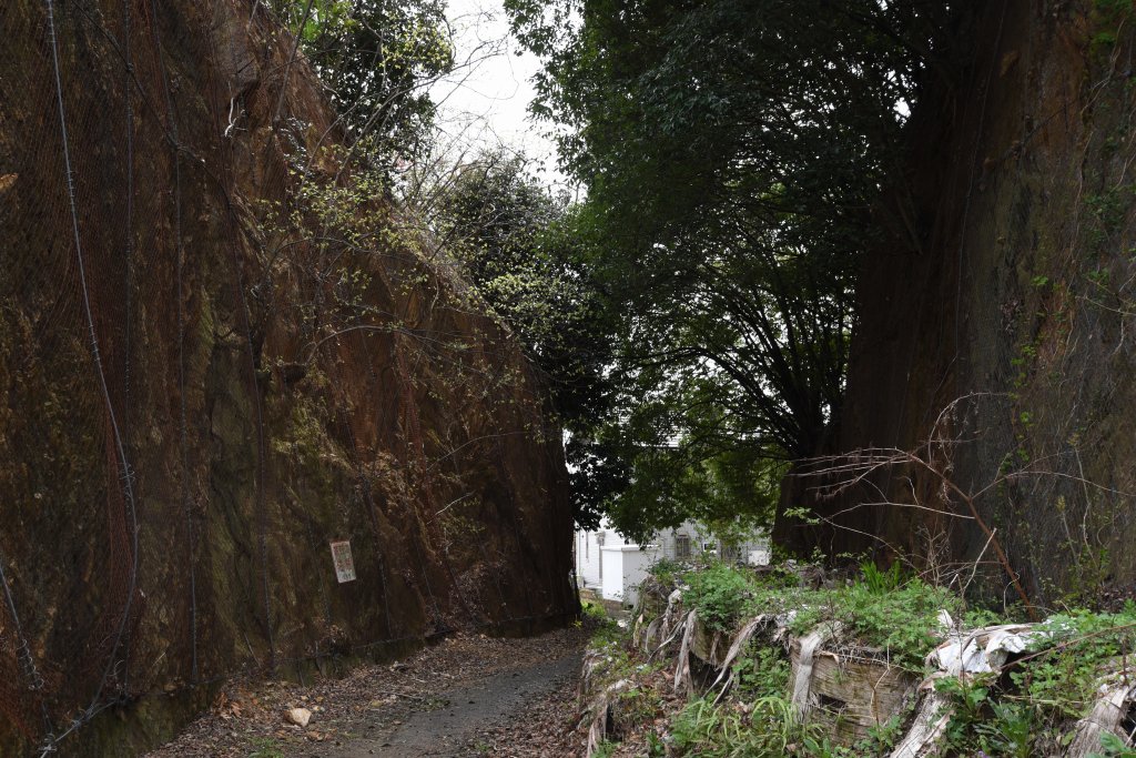 現在の足利−桐生道の深い切通しではなく,二重坂の切り通し.今は切り通しから先は人しか通れない坂道のため,忘れられたような場所になっている.今の深い切通しが掘られなければ,まっすぐ今福の集会所の方に抜けられた便利な道だったのだろう.