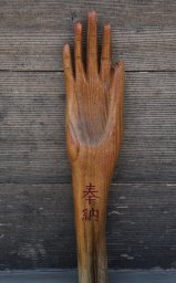 【あらすじ】 ある商人,風雅な方で,食客(いそうろう)置所との看板を出した.「お頼み申す.私は薩摩守忠度と申すもの,兵庫駒ヶ林で岡部六弥太と組み討ちの際,腕(かいな)を斬られ難渋いたすゆえ,居候を頼みます」「これはこれは由緒のあるお方じゃ.さあさあ奥へ」.今度は,法界坊に両腕を落とされたお組の父親,渡辺綱に腕を斬られた茨木童子,湯加減を盗もうとした鍛冶屋団九郎,堅田の小まんと,腕の無い食客ばかりがやって来る.最後は,文楽一人遣いの取巻人形が大勢やって来た.「沢山な居候じゃ.これ,お梅,御膳のしたくをしてあげなさい」「わたし一人で台所に手が足らぬが」「居候も手がたらぬ」 【ひとこと】 主「コリャお梅御膳の拵へを仕て進(しんぜ)升セそふしてあなた方片かいなでどふしてお上りなさるな 忠のり「わたくしは団九郎さんト左りト右ゆへ二人してかはるがはるにたべ升 「浄るりの人形衆はへ 「ヘイわたくしらはすり鉢へ入てもらひ升たら首突込でたべ升 主「そりやまるで犬じやがなコリャお梅よチトきうじ仕て上升へ(古人の食客) 古人の食客(こじんのしょっかく)は,『滑稽落語集』に収められている上方落語.桂柏枝(3)演.『落語事典』には「手無人」(てないど)の演題で載っている. 【つけたし】 『上方落語ノート』(青蛙房(1978))で,桂米朝は,この噺のもともとのサゲは,「一人では手が廻らぬ.うちに家内人(けないど)が大勢いるのに」「いや,あれは皆,手無人(てないど)じゃ」だったろうと推定している.おそらくサゲから先にできた話なので.確かにその方がしっくりくる.『落語事典』でも本文には出てこない「手無人」のタイトルを採用している. 平忠度は,一ノ谷の合戦で岡部六弥太に腕を斬られ,最期をとげる.神戸の駒ヶ林に首塚が,明石に腕塚がある.腕塚神社では,奉納されている片腕(写真)で患部をたたいて,悪いところを治してもらおうとお祈りする.このほかにも,腕を斬られた人物がつぎつぎと登場する. 「隅田川続俤」で,破戒僧の法界坊は,恋するお組の父親である永楽屋権左衛門の両腕を斬り落とすのみか,あまつさえ犬に食わせてしまう.茨木童子は,羅生門で渡辺綱に腕を斬り落とされるが,後日,奪還に現れる.腕をくわえて空中を飛び去るシーンが印象的.「新薄雪物語」,正宗が親心から不出来な息子団九郎の手を切り落として意見する場面(下の巻鍛冶屋).「源平布引滝」三段目,小まんのモデルのおとせ,源氏の兵に白旗を握った腕を斬り落とされても,白旗を握ったままの腕が堅田の浜に漂着した.齋藤別当実盛が堅田に現れるのは,「実盛物語」と呼ばれる段で,実盛が小まんの腕を斬ったのではない.文楽の主役の人形は,主遣い(頭と右手)と左手,足の三人で演じるが,端役の人形は一人で操作する.袖はとじられていて腕が外に出ることはない.それで,詰人形と呼ばれる.落語本文を見ると,取巻人形ともいうらしい. |