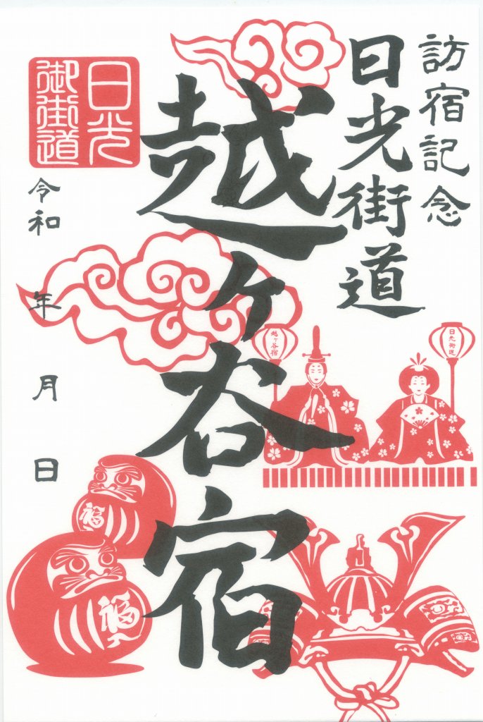 日光街道の宿場."恐れ入谷の鬼子母神"と同じように,"そうか越谷千住の先よ"と使われる.日光街道・日光西街道30宿の宿場印は,各所の名所をちりばめている.越ヶ谷宿では,2日目大里名産のダルマとひな人形,五月飾りの兜が描かれている.