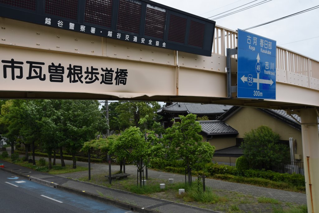 瓦曽根(かわらぞね).写真の歩道橋の先で旧道は左へ別れ,越谷宿へと入る.