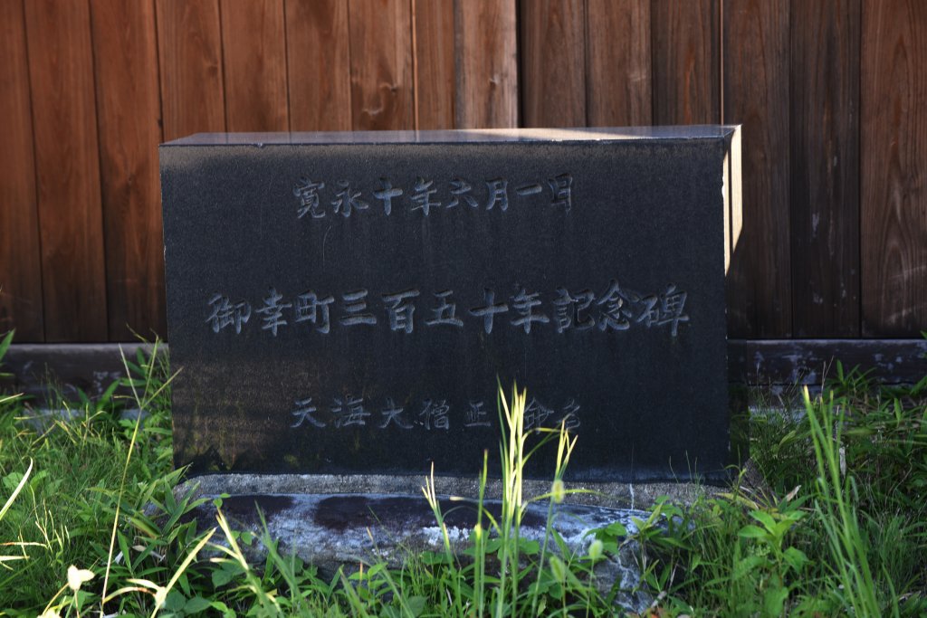 御幸町(ごこうまち).石屋町の西.駐車場の片隅に御幸町三百五十年記念碑がある.天海僧正命名とあるが,寛永10(1633)年6月1日は,天海僧正が御幸町の課役を免除した日になる.