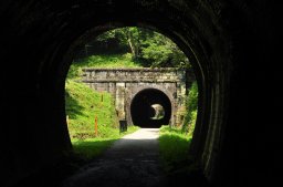 | 碓氷峠:隧道 | とんねる | 酉の初夢(時事新報 (1897)) | 安中市 | 碓氷峠越えの難所,横川−軽井沢間は1893年に開通し,これで信越本線は全通した.三遊亭圓遊(1)が『時事新報』紙に正月のご祝儀に披露した「酉の初夢」では,鉄道開通後間もない碓氷峠のトンネルをクスグリに使っている.1963年,北側に新線が開通し,その後,旧線は廃止された.現在,信越本線旧線は遊歩道として整備されており,次項の碓氷第三橋梁までの間にも6本のトンネルを通りぬける. "サウかと思ふと碓氷の隧道(とんねる)を潜る時に汽車の屋根に這い出すなんと云ふダラシもない夢を見る"(酉の初夢)  |